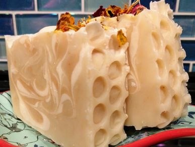 Ingredients: coconut oil, olive oil, water, lye, sunflower oil, Shea butter, castor oil, raw honey fragrance oil, raw honey, mica powder, titanium dioxide, homegrown calendula flower petals and rose petals.