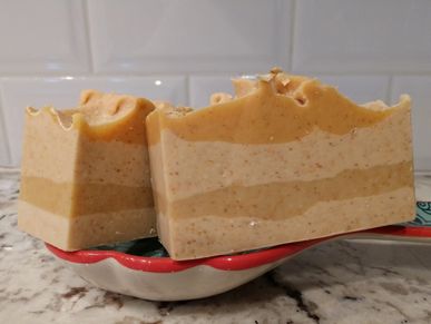 This a mild, Creamy Cleansing bar made with fresh, raw cow's milk from our farm. It is lightly scented with a coconut/vanilla fragrance. Please note that the soap will continue to darken as is cures due to vanillin content in the fragrance oil. Its final color should be similar to a chocolate bar.